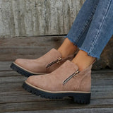 Suela de plataforma dentada, cremallera lateral, caña de ante estampado: botines que atraen miradas sin cansar tus pies.